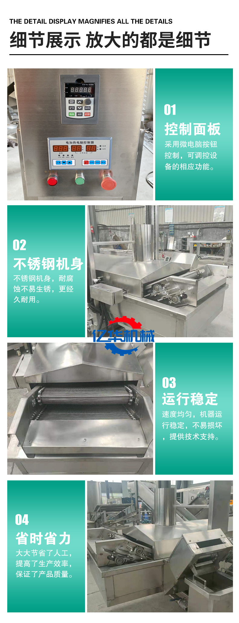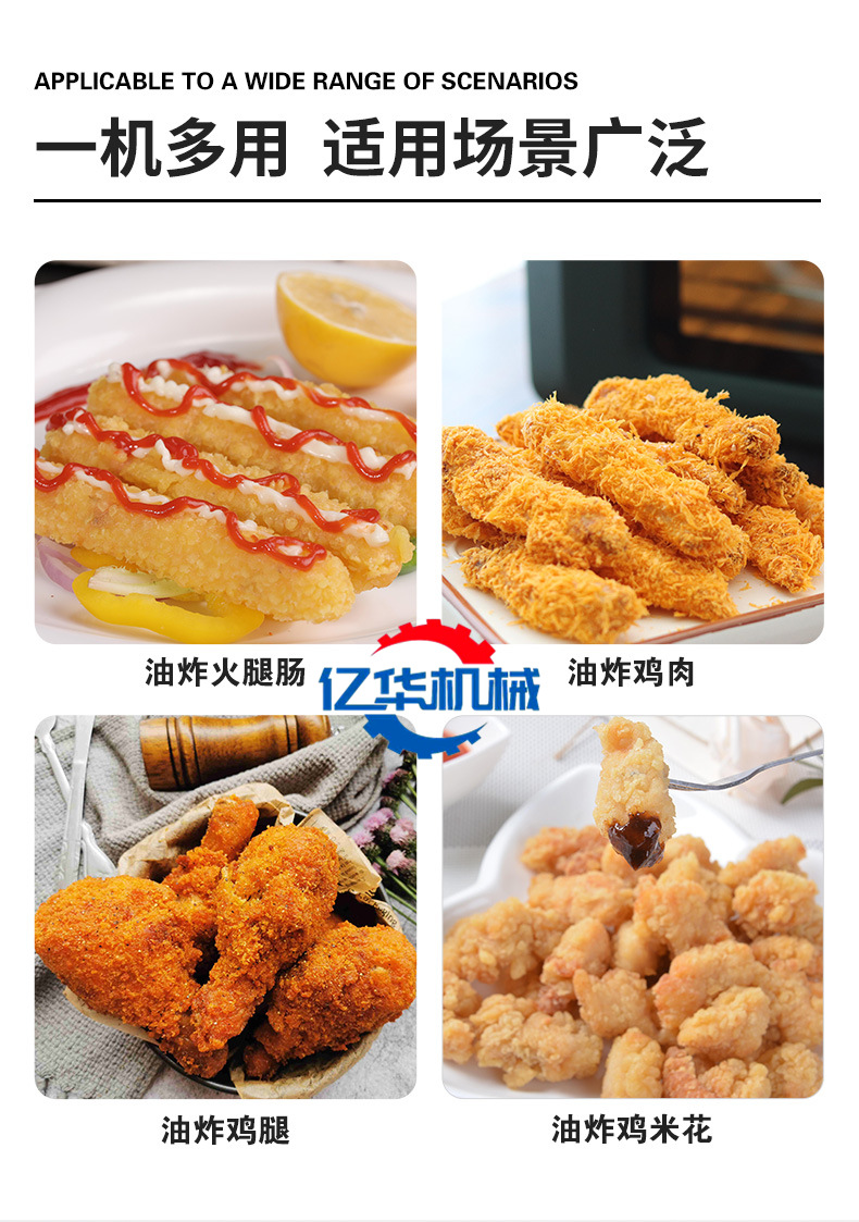 億華燃?xì)?、電加熱全自?dòng)油炸機(jī)全不銹鋼加工制造,油炸溫度自控,可根據(jù)炸制產(chǎn)品不同設(shè)置溫度,炸制時(shí)間可調(diào)根據(jù)產(chǎn)品炸制要求設(shè)置時(shí)間;獨(dú)特的產(chǎn)品輸送系統(tǒng)、排渣系統(tǒng)、油循環(huán)系統(tǒng)、排煙系統(tǒng)、電控系統(tǒng)等組成。采用網(wǎng)帶輸送產(chǎn)品變頻或無(wú)級(jí)調(diào)速。廣泛應(yīng)用于肉制品,肉塊、炸雞翅、雞米花、水產(chǎn)、蔬菜、面食等油炸食品加工。